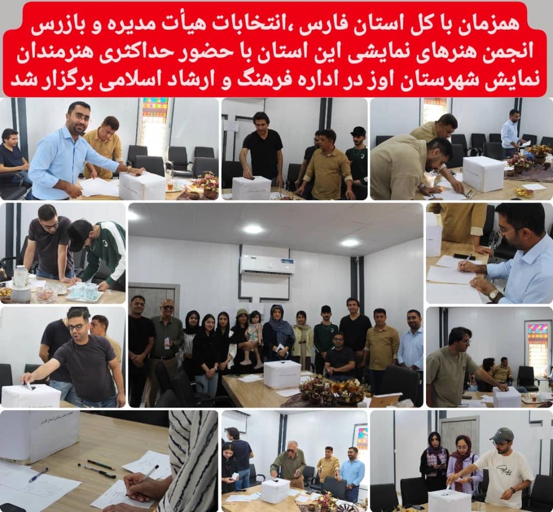 این انتخابات در روز جمعه 25 مهرماه از ساعت 10 الی 12/30 در تالار حافظ شیراز و همزمان در شهرستان ها محل اداره فرهنگ و ارشاد اسلامی هر شهرستان برگزار گردید. در اوز نیز این مهم با حضور هنرمندان به سرانجام رسید.