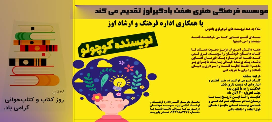 به مناسبت هفته ملی کتاب و کتابخوانی ، موسسه چند منظوره هفت بادگیر اوز با همکاری اداره فرهنگ و ارشاد اسلامی اوز اقدام به طرح مسابقه ای جذاب در مدارس نموده اند. نویسنده کوچولو نامی است که برای این مسابقه در نظر گرفته شده است. در متن پوستر چنین آمده :